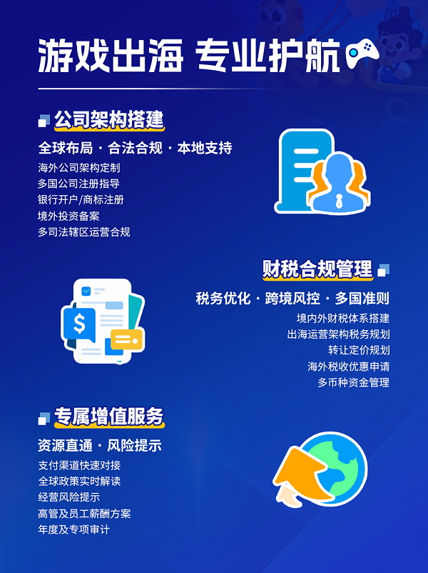 我們的服務貫穿企業生命周期。從企業初期部署開始——海外公司設立、架構構建、運營——到企業業務增長——再到企業上市前中后期的各個階段。我們服務過大量客戶,具備處理復雜跨境業務的豐富經驗和實力。無論是初創團隊還是成熟巨頭,RICHFUL瑞豐憑借其全球視野、本地經驗、一站式解決方案,致力于成為游戲企業揚帆出海的可靠導航者與堅實后盾。