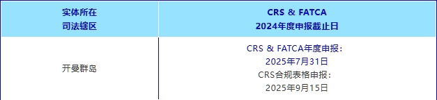 開曼群島2024年度的共同申報準則(CRS)和外國賬戶稅收合規法案(FATCA)申報截止日即將到來。該申報截止日適用于所有在2024年度成為CRS/FATCA定義下具有申報義務的開曼群島金融機構。例如,如果您已于2024年設立或者運營開曼基金/基金管理人/基金SPV/投資實體等,此事項與您密切相關。