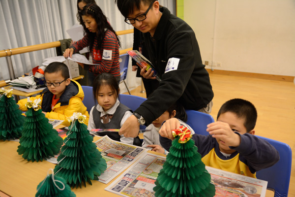 我們教小朋友制作、剪裁并鼓勵(lì)小朋友自己發(fā)揮創(chuàng)意設(shè)計(jì)圣誕樹(shù)的造型,大家坐在一起動(dòng)手制作創(chuàng)意圣誕樹(shù),不時(shí)傳出的談笑聲讓整個(gè)課室的氣氛非常溫馨。