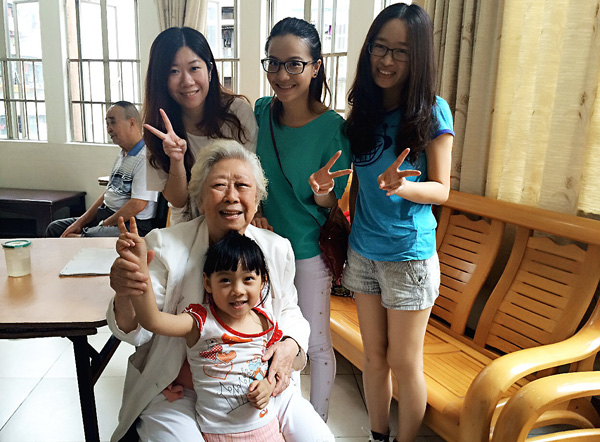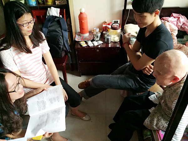 婆婆叮囑我們,年輕人要多運(yùn)動(dòng),注意休息保護(hù)好自己的眼睛。還跟我們分享年輕時(shí)候生活的艱辛,婆婆的活潑開朗使氣氛都活躍起來,她告訴我們要時(shí)刻保持樂觀愉快的心情,年紀(jì)雖然大,但是心態(tài)要年輕,還要每天堅(jiān)持讀報(bào)。