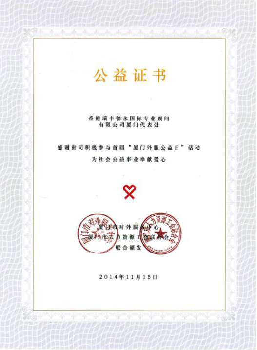 主辦單位:廈門(mén)對(duì)外服務(wù)中心頒發(fā)公益證書(shū)